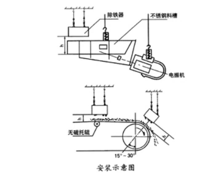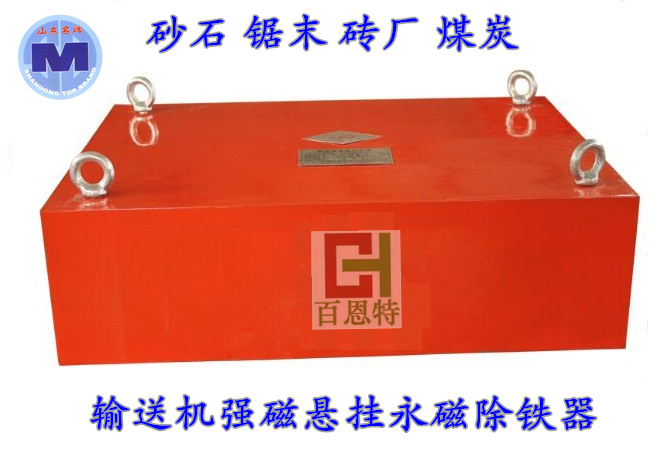 懸挂式永磁除鐵器內部採用高矯頑力,高剩磁的特殊永磁體“釹鐵硼”等材料組成復合磁係。具有免維護、磁力強、壽命長、安裝簡單、使用方便、運行可靠等優點,選用於皮帶機、振動輸送機、電磁振動給料機、下料溜槽上的非磁性物料中除鐵。清除0.1∼25公斤的鐵磁性物質,內部永磁磁係使用壽命10年以上。該產品各項技術指標均符合JB/T8711-1998標準。當永磁鐵吸附鐵磁物較多時,人工用非磁性刮板清除或戴手套摘除,適用於連續工作,含鐵較少的場合。