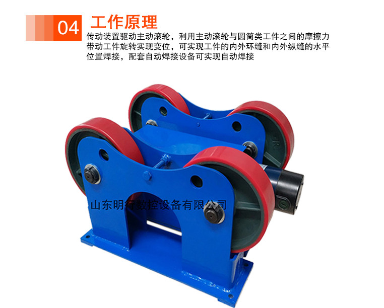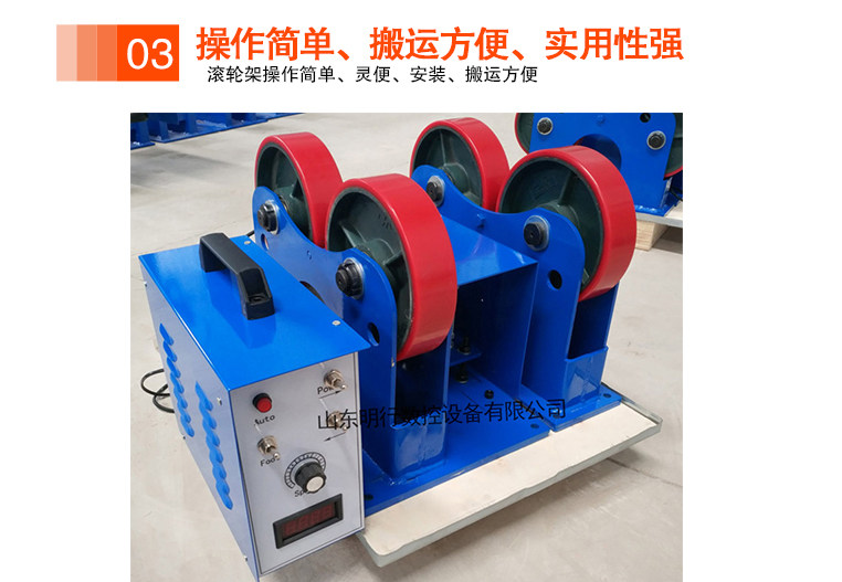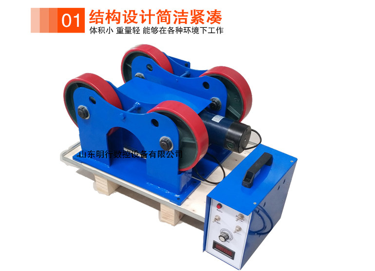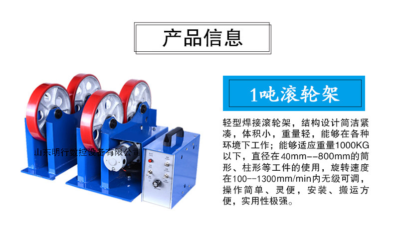 輕型1噸焊接滾輪架,結構設計簡潔緊湊,體積小,重量輕,能夠在各種環境下工作,能夠適應重量1000KG以下,直徑在20mm--800mm的筒形、柱形等工件的使用,旋轉速度在80--1000mm/min內無級可調,操作簡單、靈便,安裝、搬運方便,實用性強。