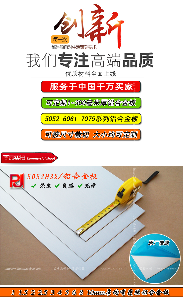 可定制裁切薄/中/厚鋁合金板,覆膜薄板有1 1.5 2 2.5 3 4 5 6 8 10毫米厚—厚度均勻標準,板面平滑規整無劃傷;國產常用為6061鋁板厚度有8 10 12 15 20 22 25 30~300毫米無覆膜(有輕微劃傷),裁切尺寸統一,價格實惠庫存量大,可開正規17%增值稅發票!