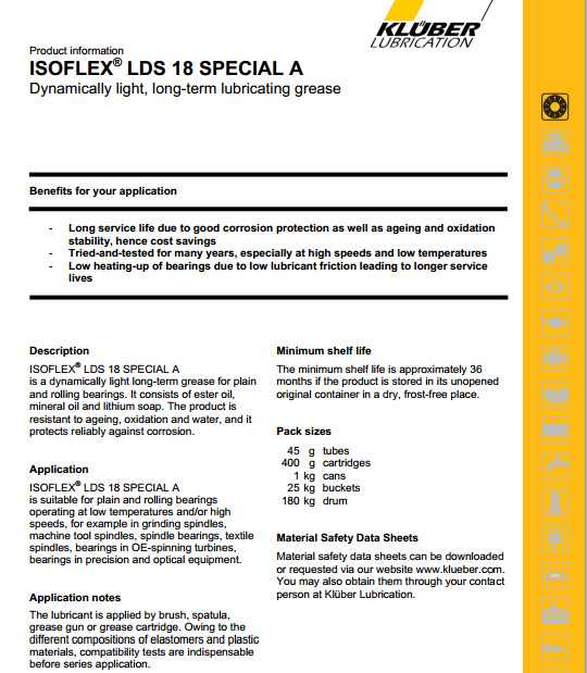 KLUBER ISOFLEX LDS 18 SPECIAL A低噪音高速軸承脂德國 KLUBER ISOFLEX LDS 18 SPECIAL A潤滑脂是一種輕載長壽低噪音高速軸承脂。應用特性:PCB線路板鑽孔機絲桿導軌用油脂,紡織機械高速主軸用油脂。速CNC、磨床主軸、高速木工機械指定用潤滑脂。主要由礦物油、酯類油、鋰皂組成,適用於高速低溫輕載荷滾動軸承及滑動軸承的潤滑,