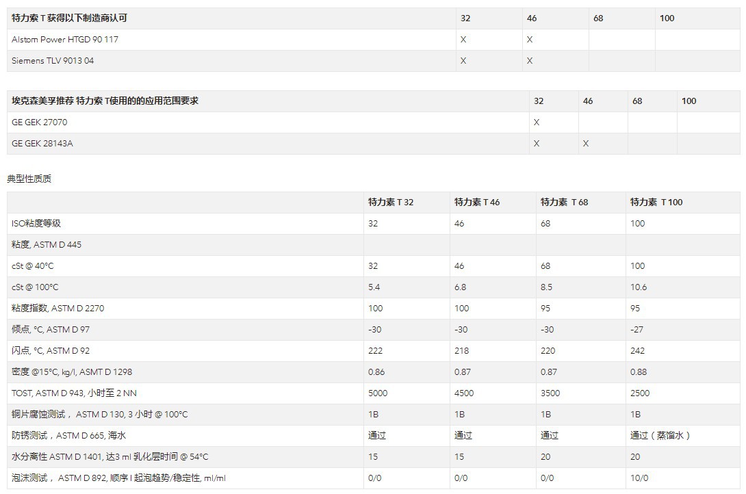 ¯S¤O¯ÁT 32-100 ¬O¤@ºØªº´õ½ü¾÷¤Î´`Àô«Y²Î¼í·Æªo¡A¼sªx¾A¥Î©ó¦hºØ¤u·~¥Î³~¡C¸Ó²£«~«Y¦C¥Î©ó¨T½ü¾÷¡B»´«¬©T©w¦¡¿U®ð½ü¾÷¥H¤Î´`Àô«Y²Î. Teresstic T 32-100ªo«~¸g¹L¦h¦~¨Ó¤£Â_§ï¶i¡A±Ä¥Î°ò¦ªo©M²K¥[¾¯°t¨î¡A¥]¬A§Ü®ñ¤Æ¾¯¡B¨¾ùײK¥[¾¯¤Î©M»G»k§í¨î¾¯¥H¤Î§Üªw¾¯¡C¯S¤O¯ÁT 32-100 ¦³¥|ºØÖ߫׵¥¯Å¡A±qISO VG 32 ¨ì 100¡C¯S¤O¯ÁT 32 ©M 46¥Î©ón¨D¨ã¦³®ñ¤ÆÃ©w©Ê¡B¨¾ù׫OÅ@¤Îºî¦X¯S©Ê¡]¦p¨ã¦³¨}¦nªºªÅ®ðÄÀ©ñ©Ê¡B§Cªwªj¶É¦V©M§Ö³tªÅ®ð¤ÀÂ÷¡^¼í·Æªoªº´õ½ü¾÷À³¥Î¡C