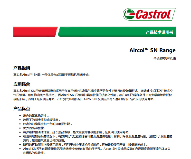 @嘉實多Aircol SN 壓縮機用潤滑劑適用於在高壓縮比和高出氣溫度等嚴苛條件下運行的旋轉螺桿式、旋轉葉片式以及往復運動式空氣壓縮機。和礦物油類產品相比,因Aircol SN壓縮機油具有的抗氧化性能,故在極為不利的操作條件下可大幅度地降低積碳的形成,有利於延長油品壽命,在往復式機組中,Aircol SN 級油品具有長達礦物油產品八倍的使用壽命。