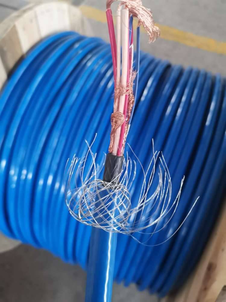 4. 成纜時把四根線芯排列為紅,綠,藍,白,排流線,排流線要和線芯一起絞合,千萬不要縱放,成纜時不要加填充物,纜芯外用鋁箔繞包,而後再繞包一層聚酯膜,在外有一層銅絲編織屏蔽(屏蔽銅絲不鍍錫)。